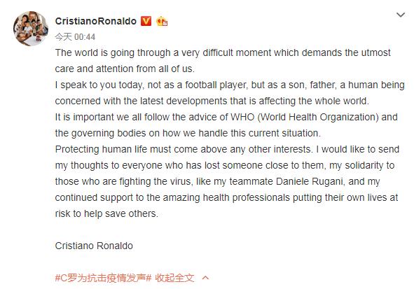 梅西希望用自己的声音唤醒更多人对疫情的重视。而身为足坛绝代双骄的另一份子,C罗甚至一度陷入舆论的巨大担忧中。