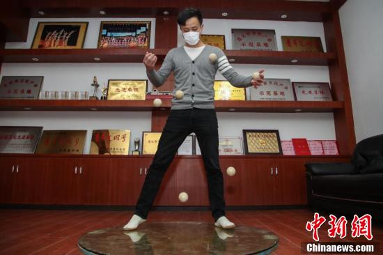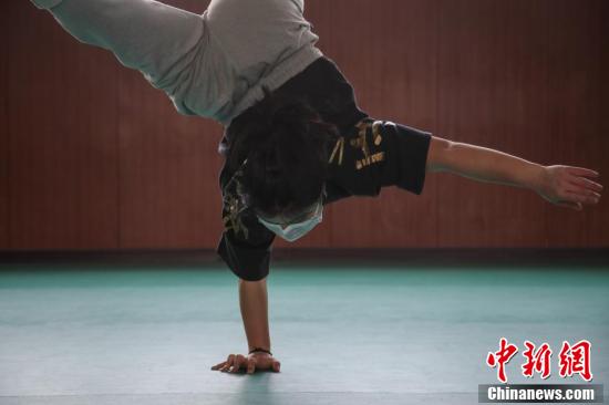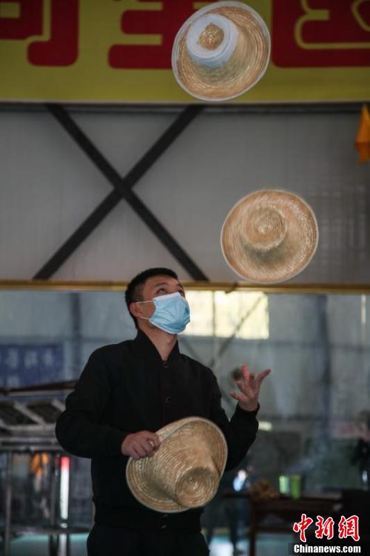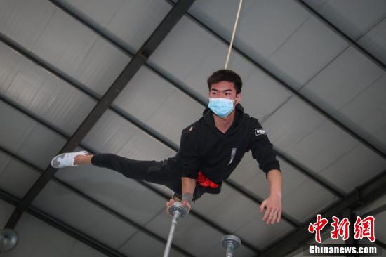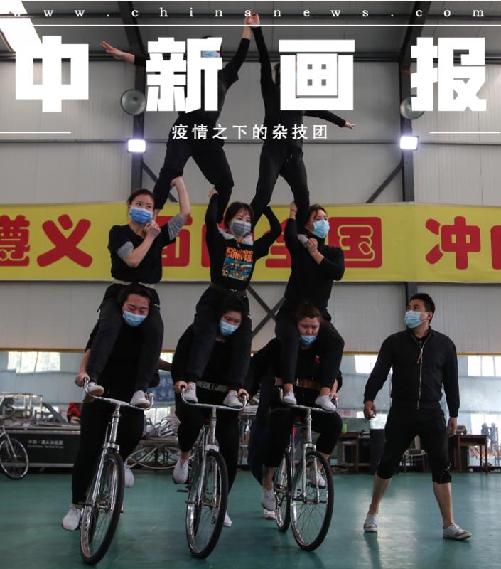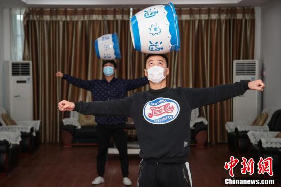 3月20日,演员们训练“车技”。受疫情影响,虽然赴美演出时间尚未最终确定,但在贵州省遵义市汇川体育中心内,遵义市演艺集团杂技团的演员们为了不影响赴美国演出剧目《华夏天香》中杂技技巧的质量,仍在加紧隔离训练,训练时除危险系数极高技巧可以不戴口罩外,其余训练均戴口罩进行。