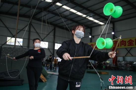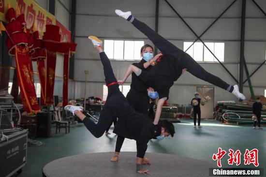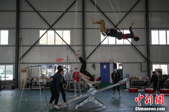 演员们训练“跳板蹬人”节目。(中新社记者 瞿宏伦 摄)