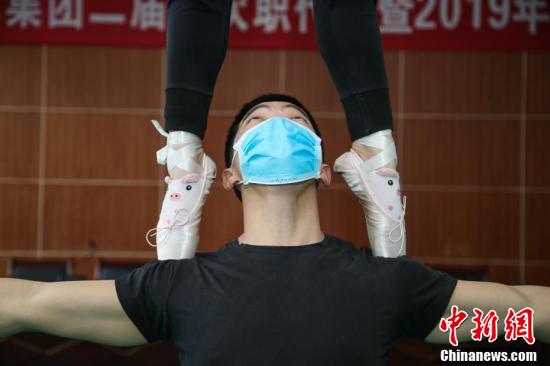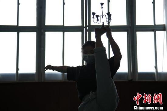 演员杨德顺和搭档在排练厅训练“肩上芭蕾”。