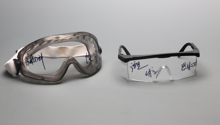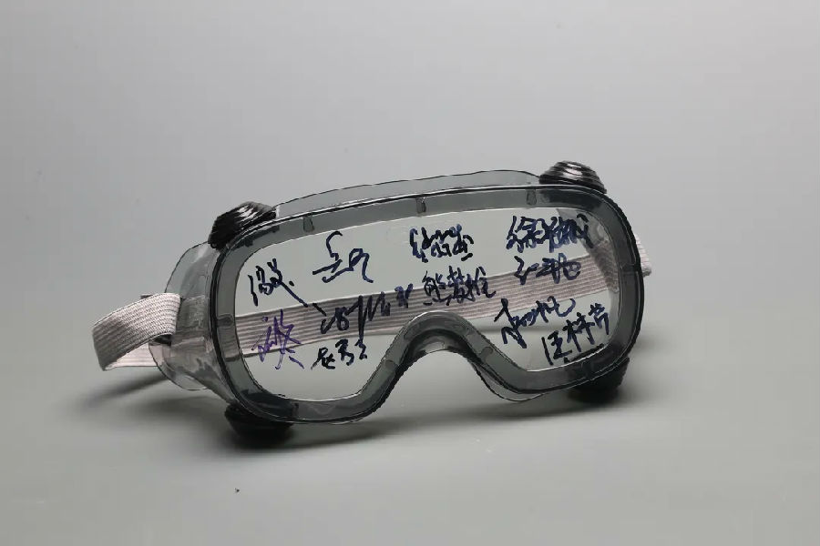 军队支援湖北医疗队省妇幼保健院光谷院区感染三科人员集体签名的护目镜(军博馆藏)
