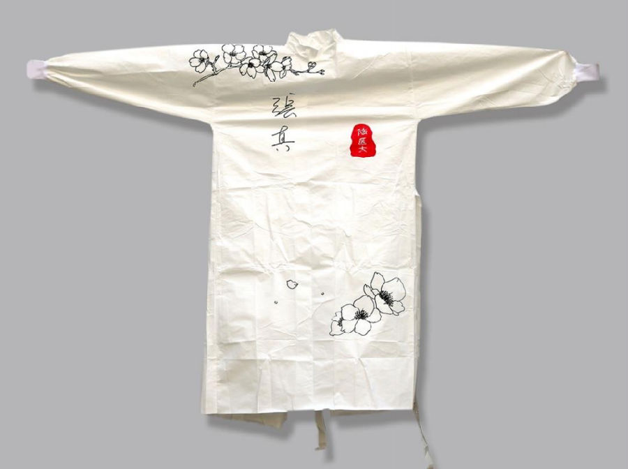 武汉泰康同济新冠肺炎专科医院医疗队员张真手绘的樱花防护服(军博馆藏)