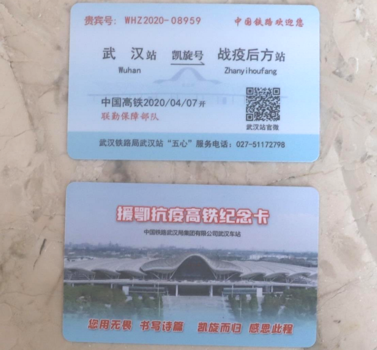 武汉铁路局为乘高铁回撤的军队支援湖北医疗队队员制作的援鄂抗疫高铁纪念卡