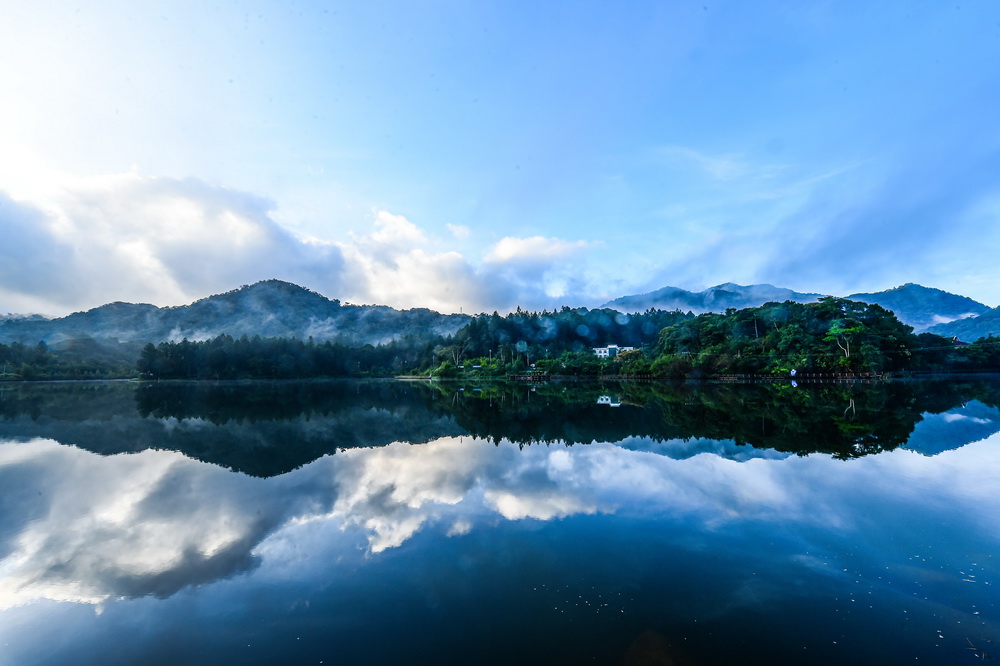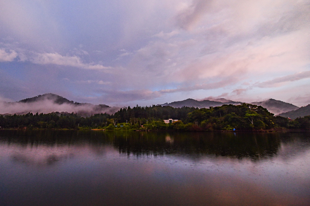 这是9月3日拍摄的黄昏中的海南热带雨林国家公园尖峰岭和尖峰岭天池景色。