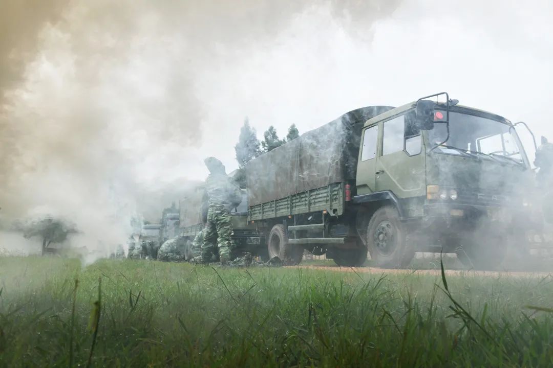 梯队长下达命令快速就近隐蔽待机。接令后,原本如长龙一般的车队迅速展开伪装……