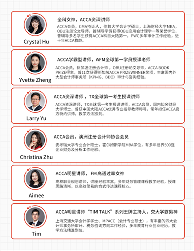 泽稷教育集合众多优秀的ACCA讲师,具备广博的专业知识和丰富的教学经验,为学员提供高品质课程教学服务,全明星讲师阵容,为你的学习保驾护航。