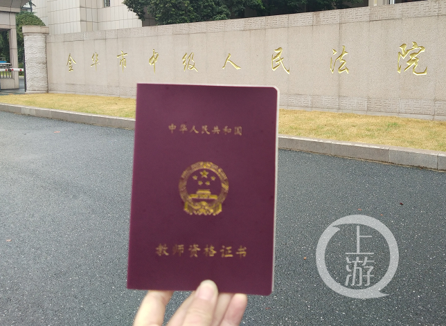 ▲9月14日上午,金华市中级人民法院前,领到教师资格证的王丽。图片来源/受访者提供