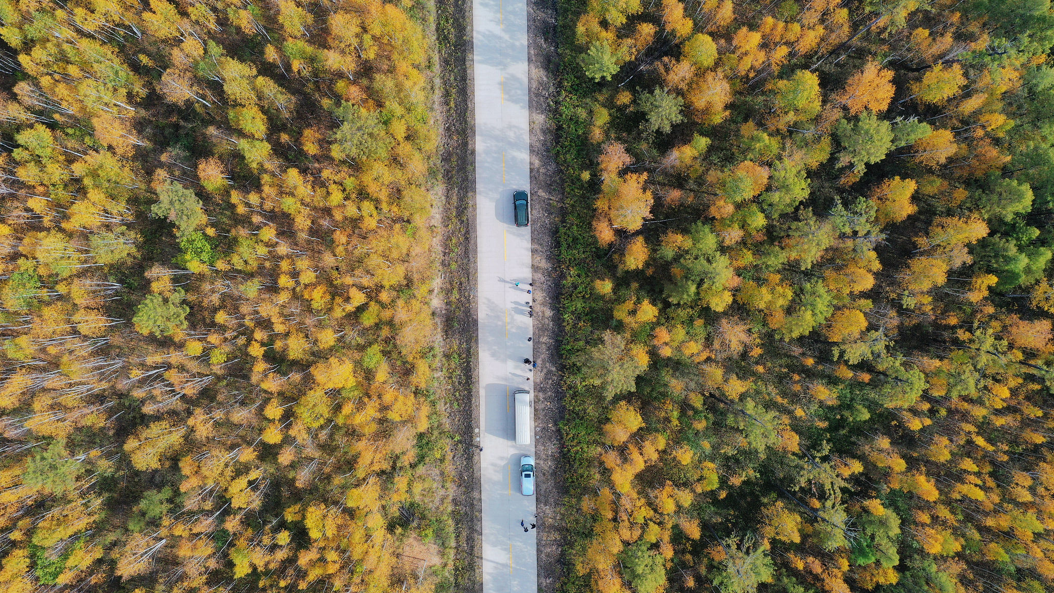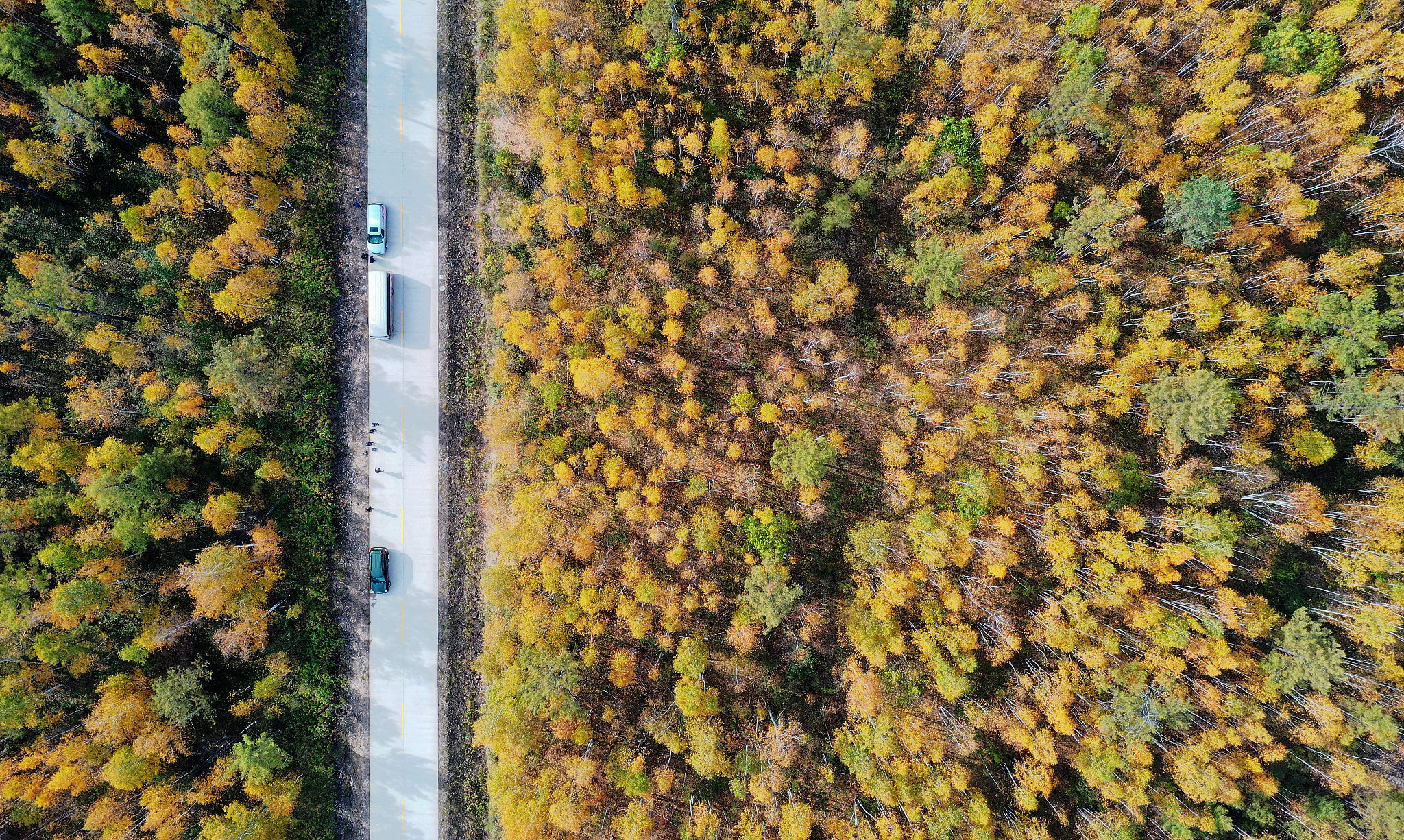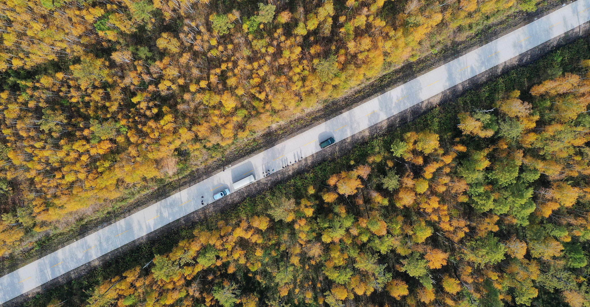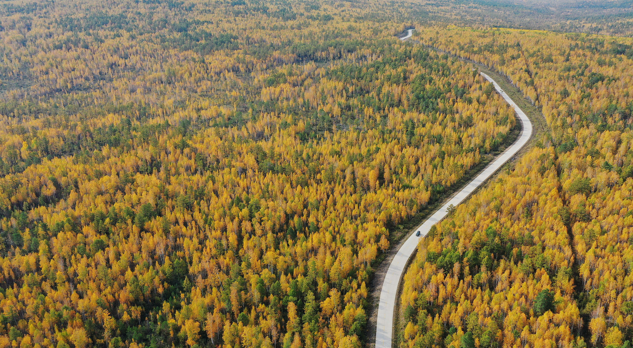 2020年9月14日,黑龙江省漠河市,大兴安岭林区从北至南,渐次“变色”。北极村附近,漫山的树叶,层林尽染,群山如披锦绣,壮美迷人。