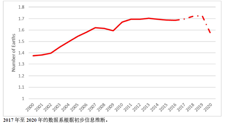报告显示,人类对生物资源的利用持续超过地球再生这些资源的能力。2011年到2016年,全球生态足迹(维持一个人、地区、国家的生存所需要的具有生物生产力的地域面积)保持在生物承载力的1.7倍左右——换言之,需要“1.7 个地球”来再生我们使用的生物资源。2020年的生态足迹估计约为“1.6个地球”。