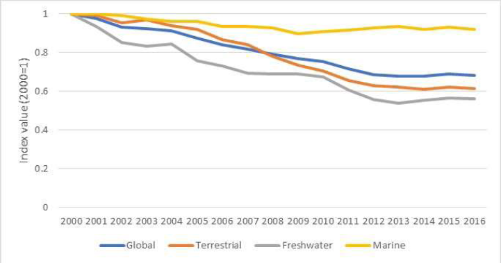 地球生命力指数是一个衡量物种丰度变化的敏感指标。从2000年以来,地球生命力指数总体下降近三分之一(32%),淡水物种种群下降最多(44%),其次是陆地物种种群(39%)和海洋物种种群(8%)。