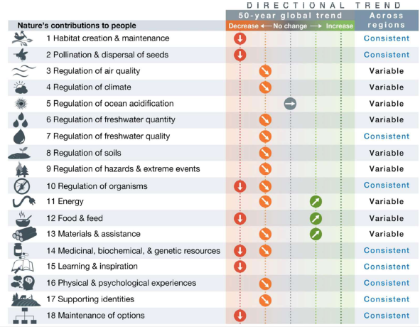 IPBES在全球范围内,将18种大自然对人类的贡献进行了评估——在过去50年里,有14种呈下降趋势,其中包括了几乎所有生态环境方面的贡献。这也意味着由于生态多样性的逐渐丧失,其本身对人类的帮助越来越弱。