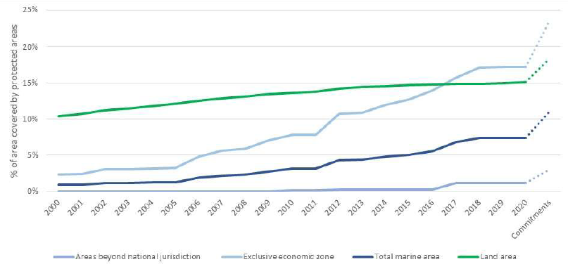 世界保护区数据库显示,到2020年8月,全球约15%的陆地和淡水环境被保护区覆盖,约7.5%的海域被保护区覆盖。迄今评估的25380种物种中,被保护区充分覆盖的物种只有43%。