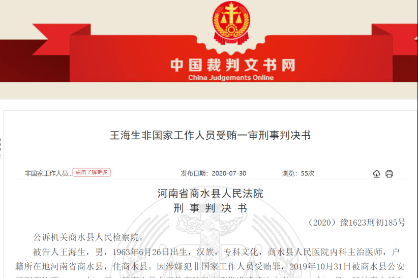 近日,裁判文书网上公布了一则非国家工作人员受贿案的刑事判决书,判决书显示,商水县人民医院内科主治医师王某某,自2016年以来,利用开处方的职务便利,非法收受陕西步长制药有限公司销售业务员苏某药品回扣款12.5万元。2019年10月31日,王某某被刑事拘留。