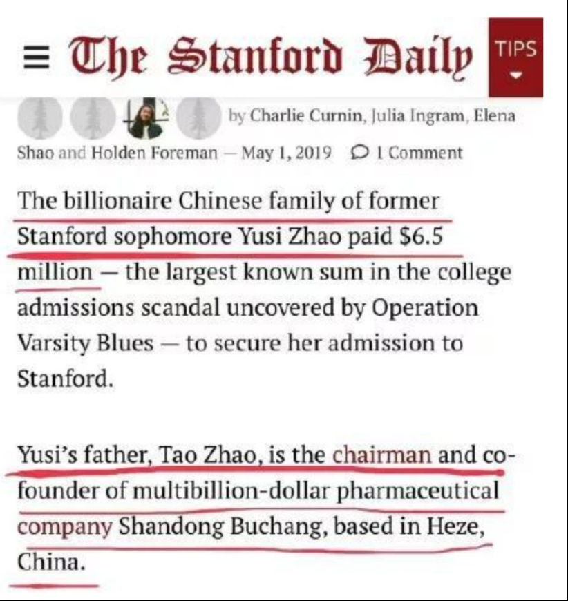 2019年5月,步长制药董事长赵涛向升学顾问威廉·辛格支付了650万美元,使其女儿Yusi Zhao在2017年以帆船选手的身份被斯坦福大学录取。