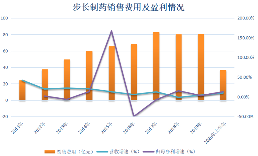 2011年,步长制药销售费用为24.45亿元。此后,步长制药销售费用呈现几何增长,到2019年,已高达80.81亿元,销售费用占当期营收的比例也由2011年的41.64%增加至2019年的56.68%。2020年上半年,销售费用为36.84亿元,占当期营收的52.36%。