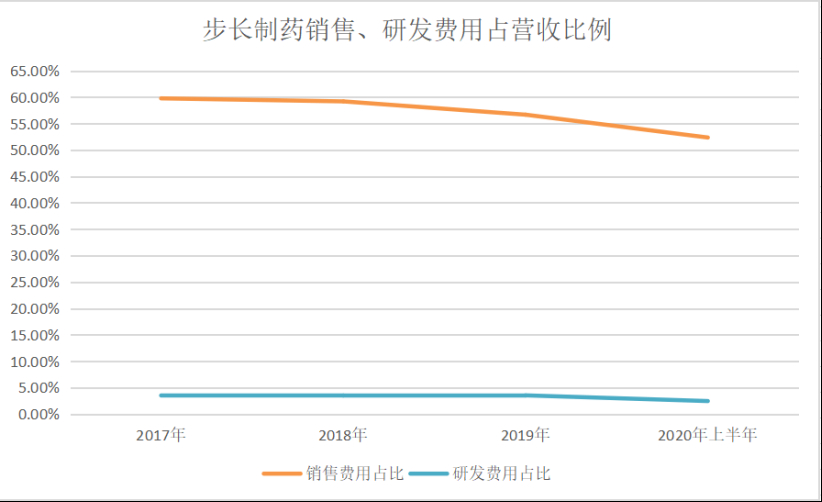另一方面,与营收占比超过50%的销售费相比,步长制药的研发费一直从未超过5%。2020年上半年,公司研发费用不足1.8亿,销售费用是当期研发费用的21倍。