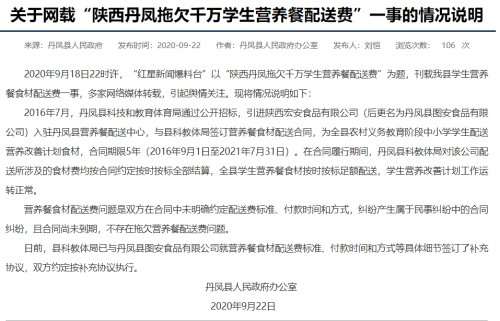 9月22日,丹凤县政府网站就“拖欠千万学生营养餐配送费”一事做出情况说明,称2016年7月,丹凤县科技和教育体育局通过公开招标,引进陕西宏安食品有限公司(后更名为丹凤县图安食品有限公司)入驻丹凤县营养餐配送中心,与县科教体局签订营养餐食材配送合同,为全县农村义务教育阶段中小学学生配送营养改善计划食材,合同期限5年(2016年9月1日至2021年7月31日)。在合同履行期间,丹凤县科教体局对该公司配送所涉及的食材费均按合同约定按时按标全部结算,全县学生营养餐食材按时按标足额配送,学生营养改善计划工作运转正常。