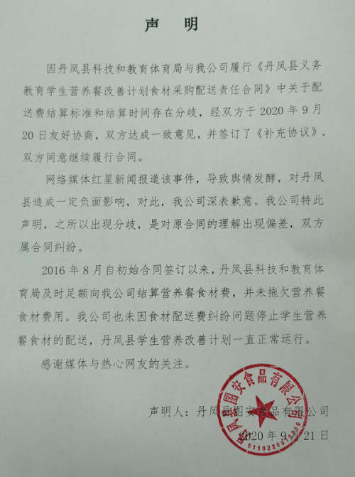 与此同时,记者注意到,丹凤县图安食品有限公司已于9月21日发布致歉声明,称之所以出现分歧,是对原合同的理解出现偏差,双方属合同纠纷。该声明同样指出县科教体局及时足额结算营养餐食材费,未拖欠营养餐食材费用。