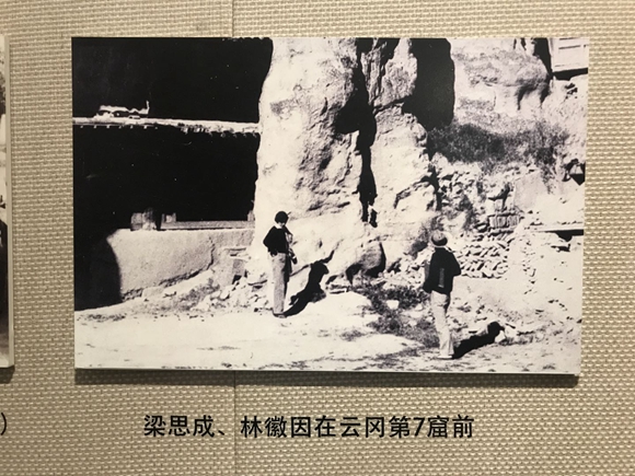 图片说明:梁思成、林徽因在云冈石窟第7窟前。(资料图片)