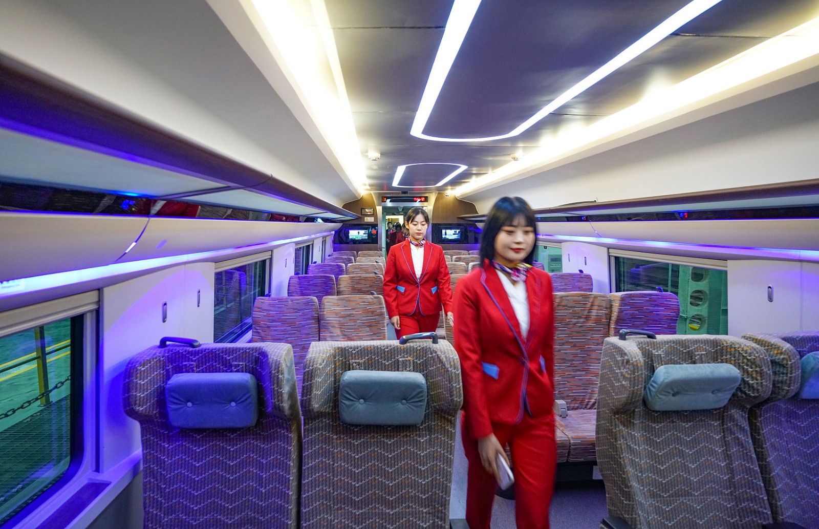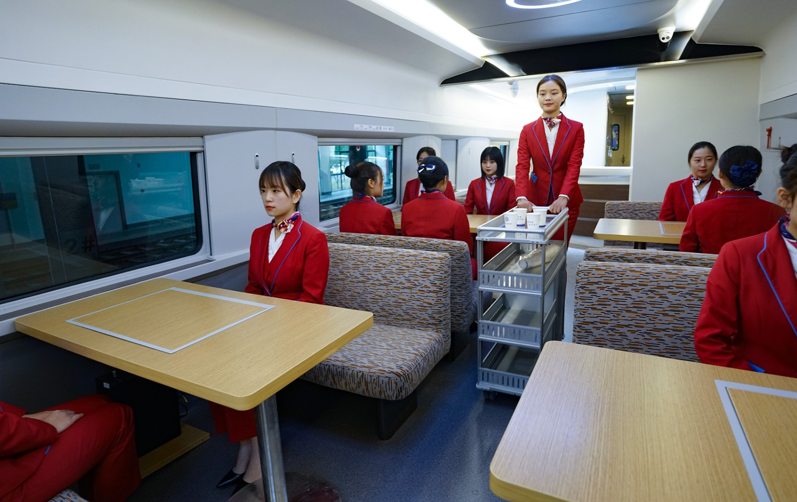商务座、一等座、二等座、餐车……据介绍,该校的两节车厢分别为动车组的1号和5号车厢,每节车厢是标准26米长,是按照“复兴号”动车组原型一比一仿真打造。