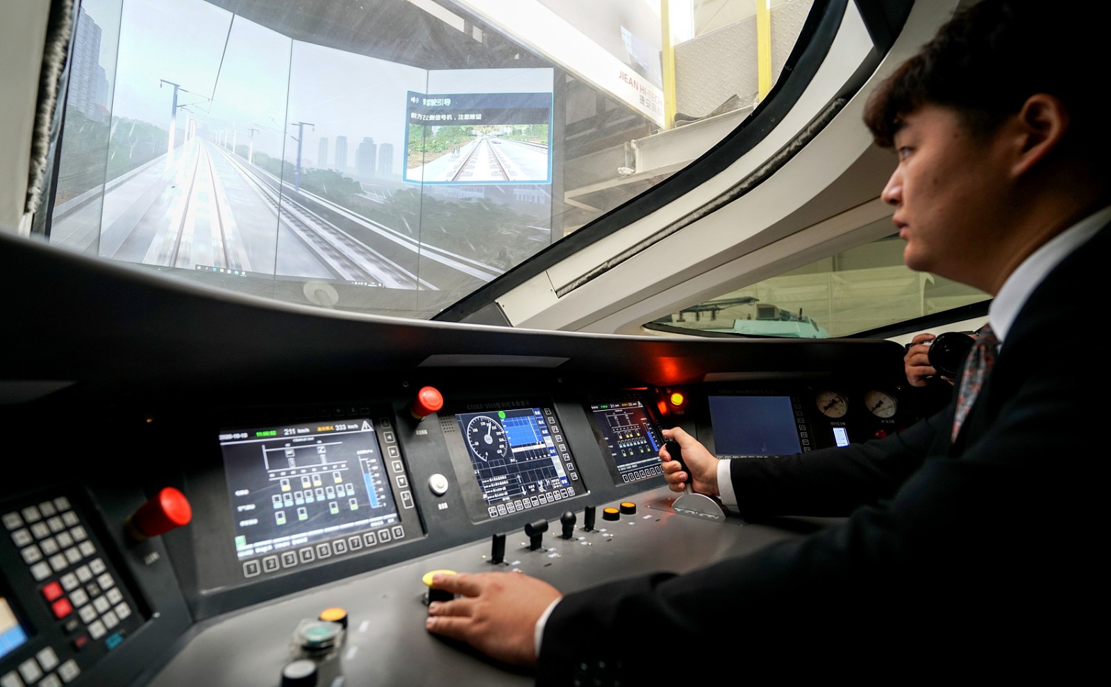 从外形上看,仿真车厢与动车组原型无异,登上车厢,高铁乘务专业的学生正在上课,一个个身着制服的学生模拟服务场景,驾驶舱内驾驶员正在做发车前的准备,透过驾驶舱可以看到前方显示屏中模拟的场景,亦是铁路某车站的实景。现场学生直言,“实景课堂比传统课堂更形象,上课就像上班一样。”