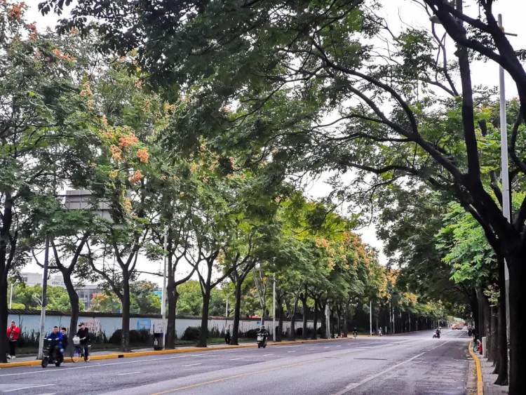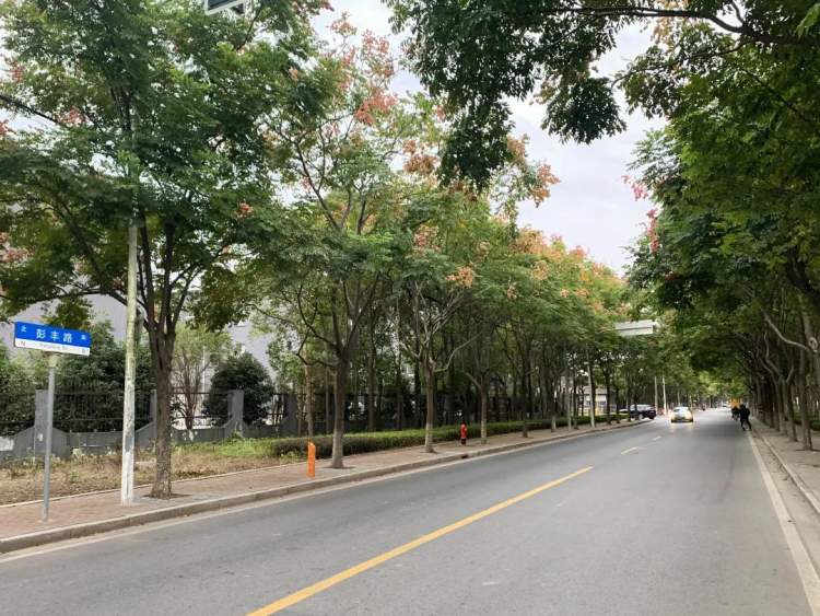绥德路的栾树林荫道位于绥德路620号到三角科技园之间。栾树为街道增添了一点静谧,而红花与都市的活力相映成趣。