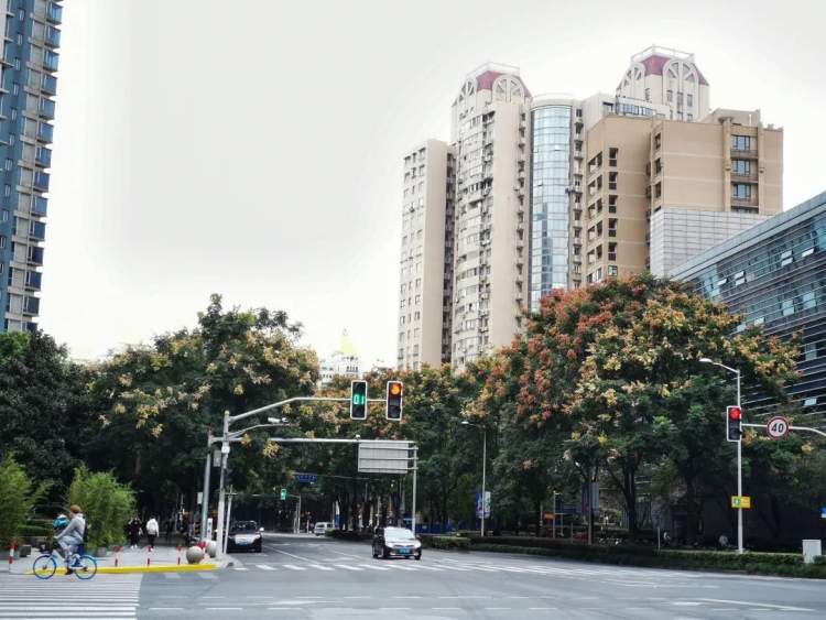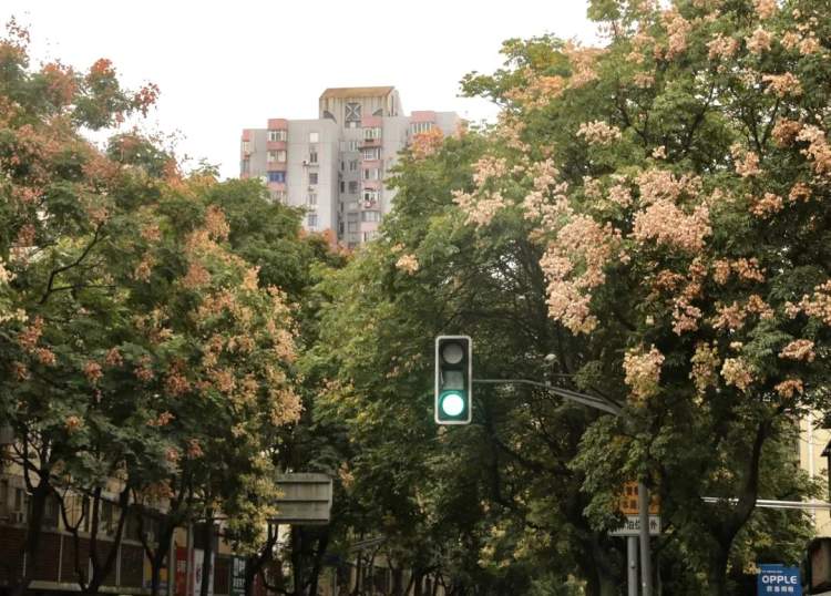 都春路两旁栾树茂密,往来的人却不多。栾树花为幽静的氛围增添了一分惊喜。