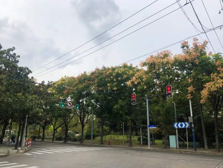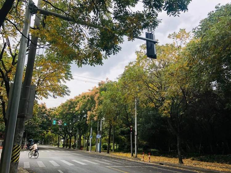 南辅路的林荫道位于莘凌路与西环路之间,一派苍翠中金色交错成团,行走在其中,浪漫无比。