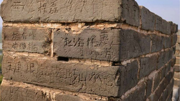 图说:游客在长城城砖上刻字。网络图
