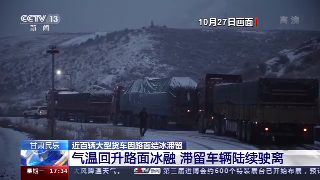 受降雪影响,从10月27日夜间开始,甘肃张掖民乐县境内国道227线扁都口段路面结冰,陆续有近百辆大型货车滞留。截至28日中午,随着气温回升,路面结冰逐步消融,滞留车辆已经缓慢驶离。