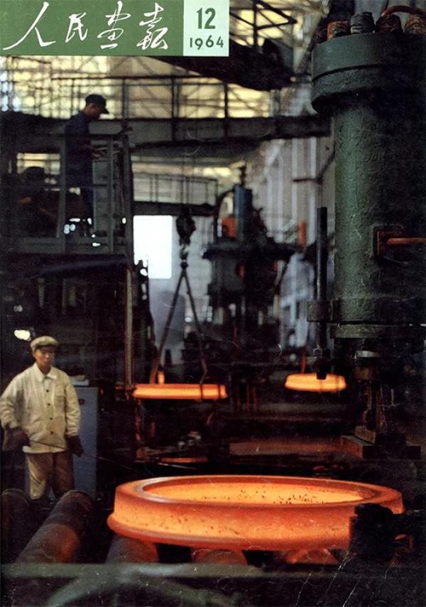 《人民画报》1964年12月刊封面,车轮轮箍厂工厂生产场面。1964年10月,中国第一个火车车轮轮箍工厂正式投入生产,标志着中国进口此类产品的时代结束,是“自力更生”的重大成果。