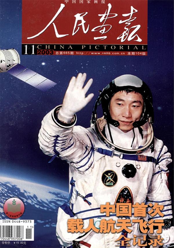 《人民画报》2003年11月刊封面,中国首次载人航天飞行航天员杨利伟。2003年10月15日,中国进行首次载人航天飞行。“神舟”五号载人飞船的发射成功,标志着中国已经成为世界上独立自主地完整掌握载人航天技术的国家之一。