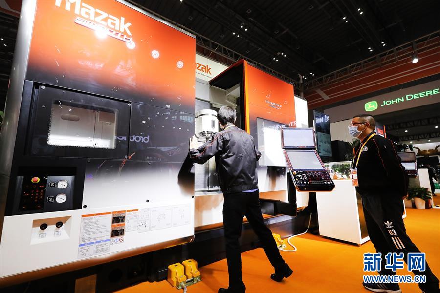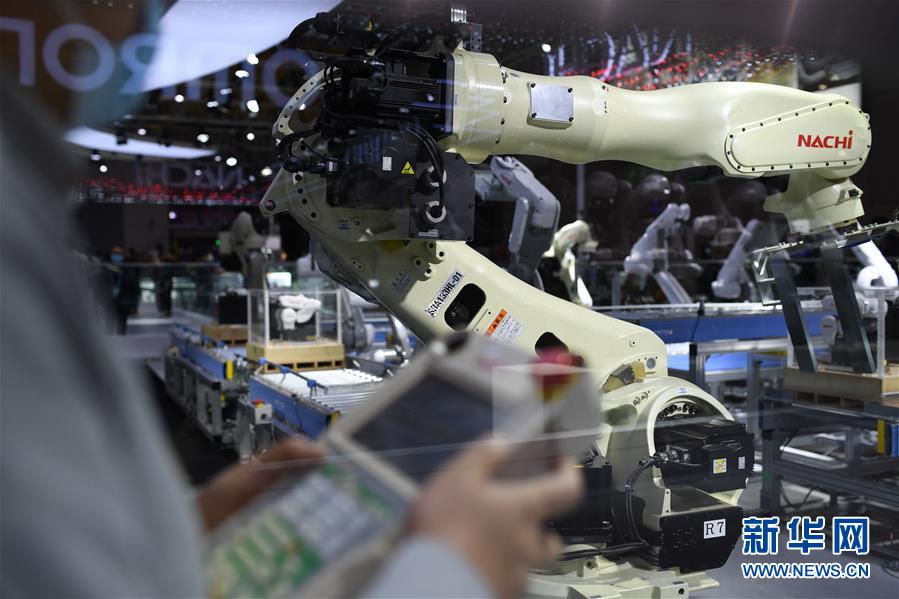 在进博会技术装备展区,工作人员操作NACHI工业机器人。