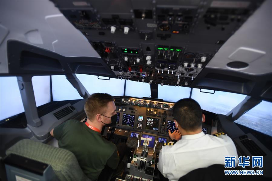 在进博会技术装备展区,一名观众在莱特兄弟展台体验飞行模拟器。