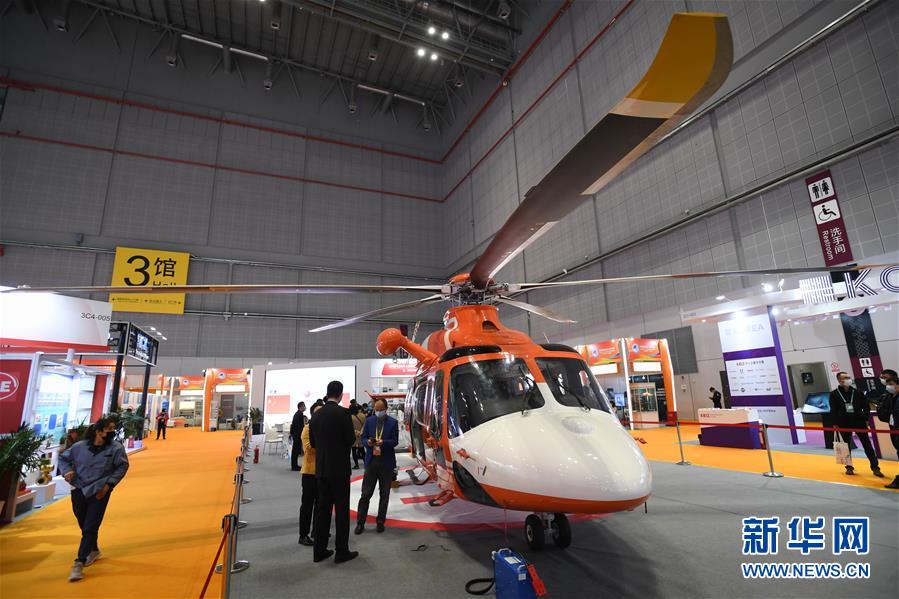 在进博会技术装备展区拍摄的意大利莱昂纳多AW139直升机。