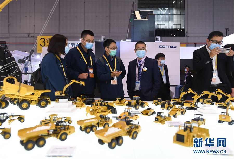 在进博会技术装备展区卡特彼勒展台,参展商在介绍工程机械等展品。
