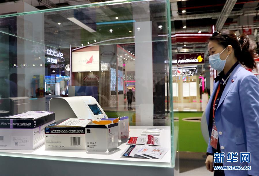在公共卫生防疫专区,参观者观看雅培展示的便于携带且适用于大规模检测的新冠病毒快速抗原检测试剂和产品。
