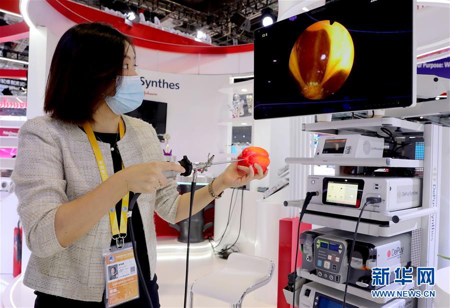 在第三届进博会医疗器械及医药保健展区强生展台,工作人员借助工具演示关节镜成像系统。