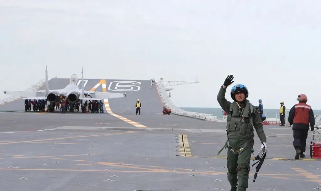 11月上旬,海军航空大学飞行学员朱彤成功着舰后,向舰面官兵挥手致意。