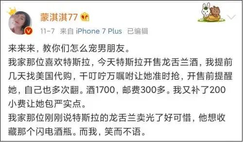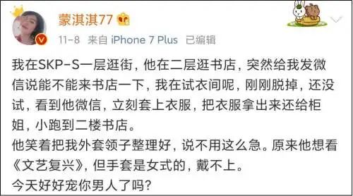 比如,“蒙淇淇77”这样表现丈夫的细心:“每次逛SKP,从车库坐电梯上去,不管有人没人,他都会蹲下来拿湿巾给我擦擦皮靴。”