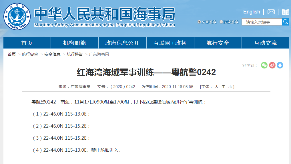 东方网·演兵场11月16日报道:据中国海事局官网消息,广东海事局发布“粤航警0241”“粤航警0242”:11月17日至11月30日,雷州半岛西部海域进行军事训练;11月17日9时至17时,红海湾海域进行军事训练。相关区域禁止船舶进入,具体区域如下: