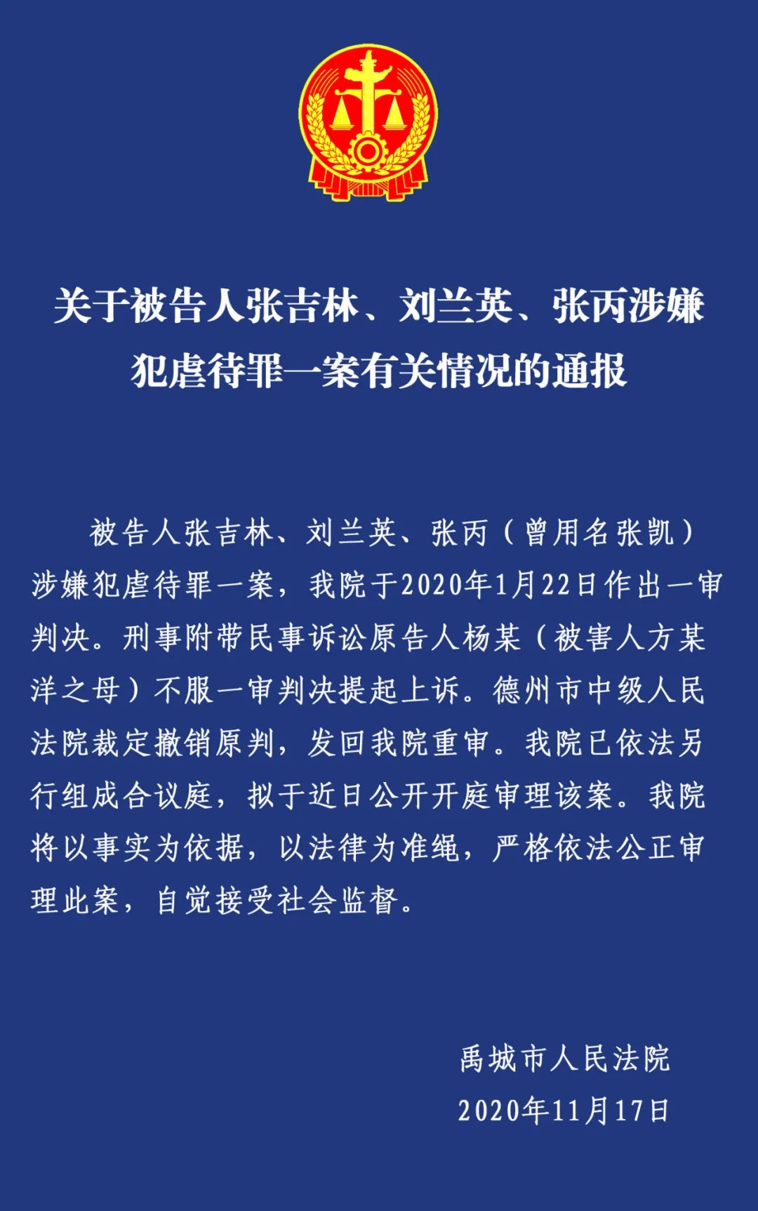 11月17日晚间,山东禹城市人民法院通报关于被告人张吉林、刘兰英、张丙涉嫌犯虐待罪一案有关情况,称将严格依法公正重审此案。