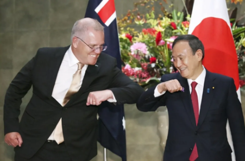 澳大利亚总理斯科特·莫里森与日本首相菅义伟碰肘致意。图源:日媒