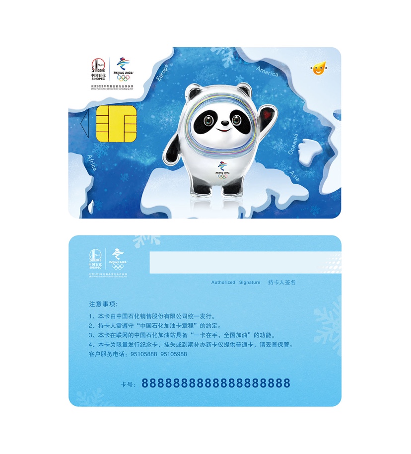 冬奥纪念版加油卡卡面设计以蓝色为主,带给人清透的冰雪感受,象征着纯洁与坚强。加油卡卡面上,憨态可掬的2022年北京冬奥会吉祥物“冰墩墩”向世界招手,传递了中国迎接冰雪盛会、拥抱世界的热情与真诚。