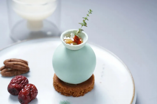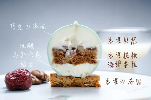 「青瓷瓶」酒酿枣泥核桃蛋糕,外形如同雅致的宋瓷,内里也同样优秀,酒酿奶油搭配枣泥核桃,层次丰富,口味清甜,还有嵌满果干的大克鼎波曲纹巧克力,浓郁丝滑,欢迎来现场品尝喔!