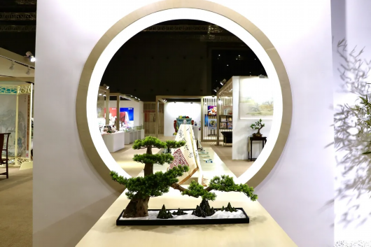 飞起的檐角、扇形的窗棂和圆形的隔断,来到上博展区,入眼便是江南水乡式的搭建,茂盛的竹子在白墙原木的衬托下,别具雅意。