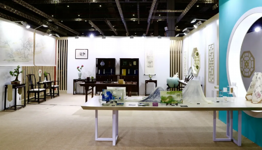走出雅苑,步入幸会江南版块。在花团锦簇的《群美图》餐垫上,艺术玻璃盘流光生彩,朱克柔的《莲塘乳鸭图》生动有趣,孙克弘的花鸟图自然清新。