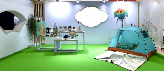 走入展区,左转来到江南雅苑版块:窗外,《江南春词意图卷》木叶初碧、游人出游,一幅融融的春景;窗内,俏皮的纸鸢斜挂如飞,绿油油的草坪上扎着两座胖墩墩的帐篷,清新的湖蓝色搭配亮眼的橙色,显示出别样的活力感。