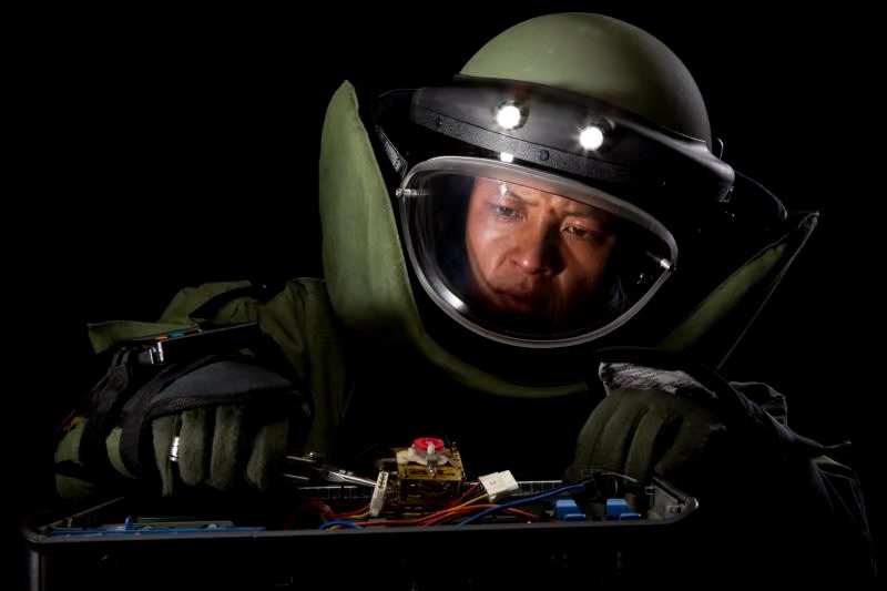 通常一个排爆警察需要经过三到五年的历练之后,才能亲自动手处置爆炸装置。要成为一名合格的排爆警察,除了靠时间慢熬,还得靠高强度的训练。排爆服头盔4公斤左右,衣服也有30来公斤,加起来身上就有近40公斤的负重。光是排爆服的适应性训练,就是一项挺不容易的事:他们必须穿上排爆服尽可能长的时间,并没有固定要求,但每一次都必须达到自己的极限。“只要还能撑,就尽量多穿几分钟,实在受不了了就赶紧脱下来缓缓。”隔着一面“墙”一样的手套来握住剪刀,在视野不是“全屏”模式的情况下,要稳稳地把炸弹里那些细小的线给精准的分离,远不是“技术活”一个词能概括的。