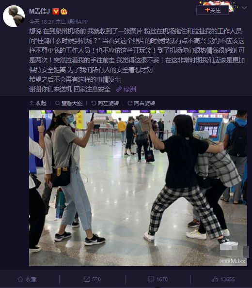 除此之外,孟佳还表示自己在机场两次突然被粉丝拉着手往前走,她直呼“我觉得这很不妥,在这非常时期我们应该是更加保持安全距离 为了我们所有人的安全着想才对,希望之后不会再有这样的事情发生”,最后孟佳谢谢粉丝们来送机,并叮嘱大家回家注意安全。